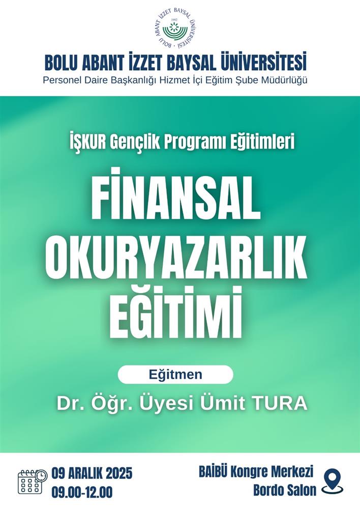 Üniversitemiz ile Bolu Çalışma ve İş Kurumu İl Müdürlüğü arasında imzalanan İŞKUR Gençlik Programı Yüklenici Sözleşmesi gereğince Üniversitemiz İşkur stajyer öğrencilerine yönelik Finansal Okuryazarlık Eğitimi 09.12.2025 tarihinde Kültür Merkezi Bordo Salonda gerçekleştirilecektir.