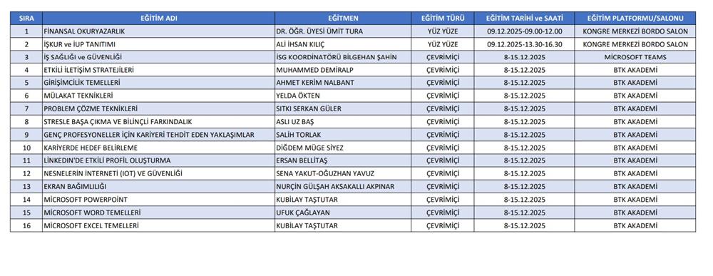 Üniversitemiz ile Bolu Çalışma ve İş Kurumu İl Müdürlüğü arasında imzalanan İŞKUR Gençlik Programı Protokolü gereğince 8 -15 Aralık tarihleri arasında birbirinden farklı yüzyüze ve online olarak verilecek olan eğitimlerle öğrencilerimizin gelişimlerine katkı sağlamak amaçlanmaktadır.