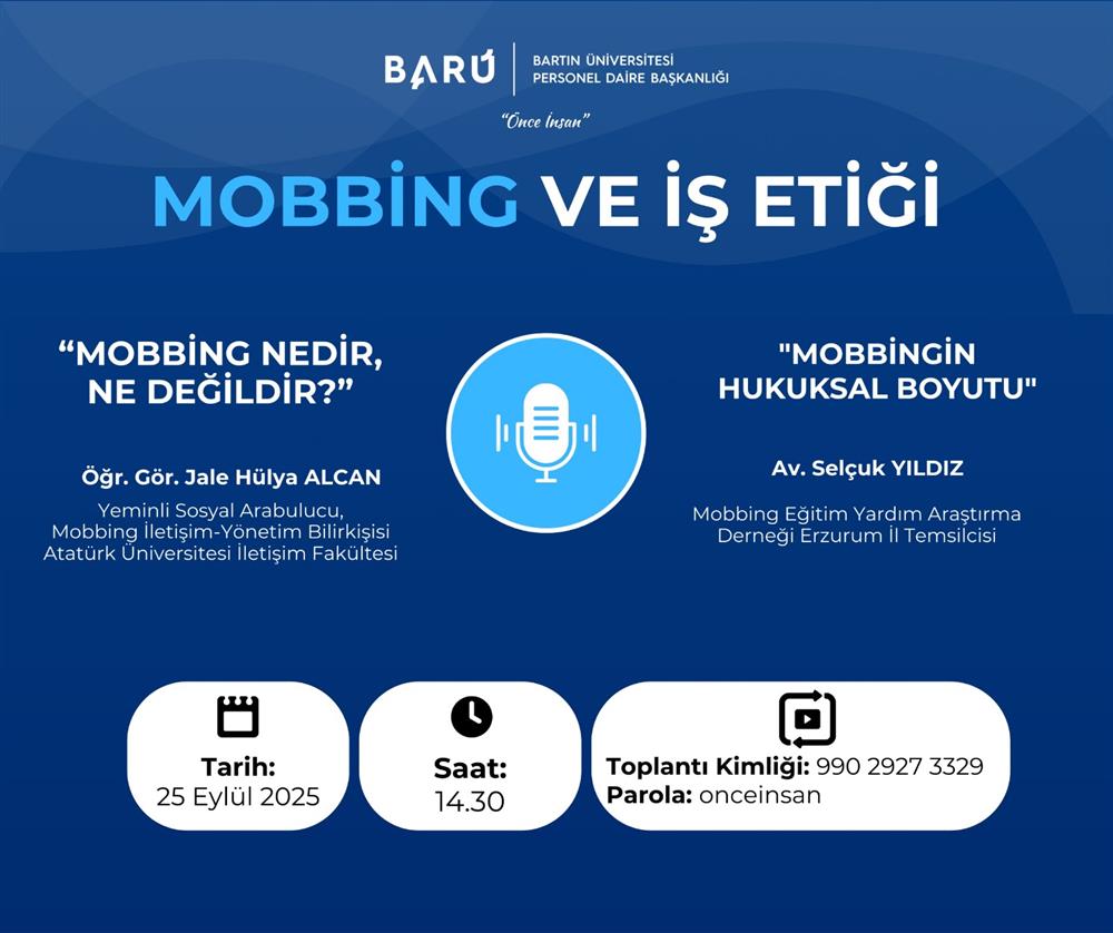 Üniversitemiz ile Bartın Üniversitesi arasında hizmet içi eğitim faaliyetlerinde iş birliği sağlamak amacıyla imzalanan protokol kapsamında 25 Eylül 2025 Perşembe günü saat 14.30'da çevrim içi olarak "Mobbing ve İş Etiği" konulu hizmet içi eğitim gerçekleştirilecektir.